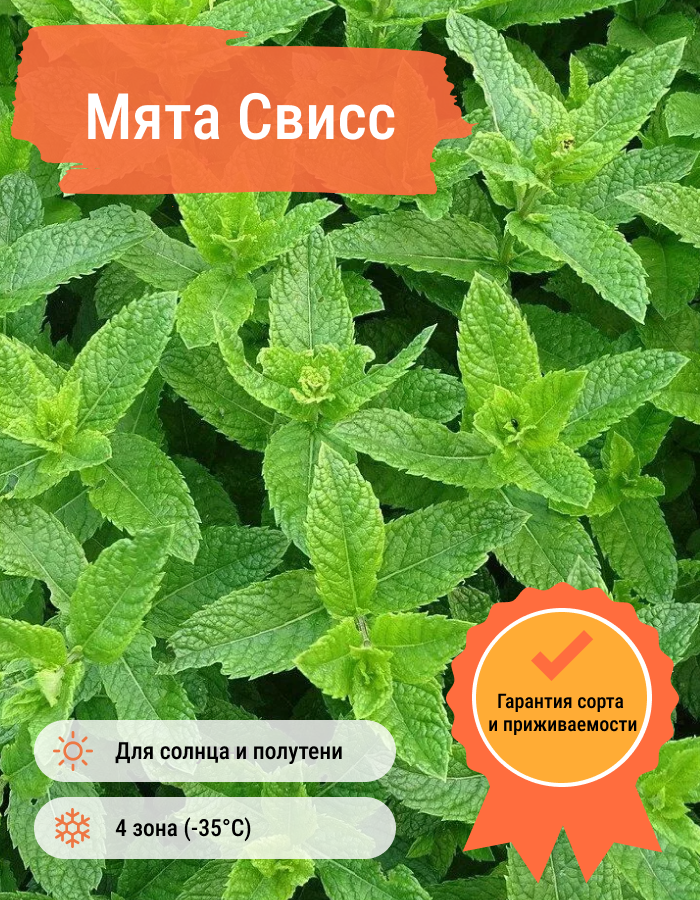 Рассада мяты перечной Swiss (Mentha suaveolens) лучше всего растет на универсальной садовой земле, перемешанной с глиной и песком. Участок для посадки выбирают частично затененный. В открытом грунте растение может достигать до 80-100 см в высоту, но при выращивании в контейнере стебли несколько ниже (40-50 см). Цветет с июля до сентября, является отличным медоносом. Листья вырастают на коротких стеблях, продолговатые, яйцеобразные, короткочерешковые, с заостренным краем. Верхняя часть темно-зеленого цвета, нижняя немного светлее. Невзрачные мелкие цветки создают колосовидные соцветия, растут на кончиках побегов. Сорт мяты перечной Swiss отличается свежим лимонным ароматом с бодрящим эффектом.