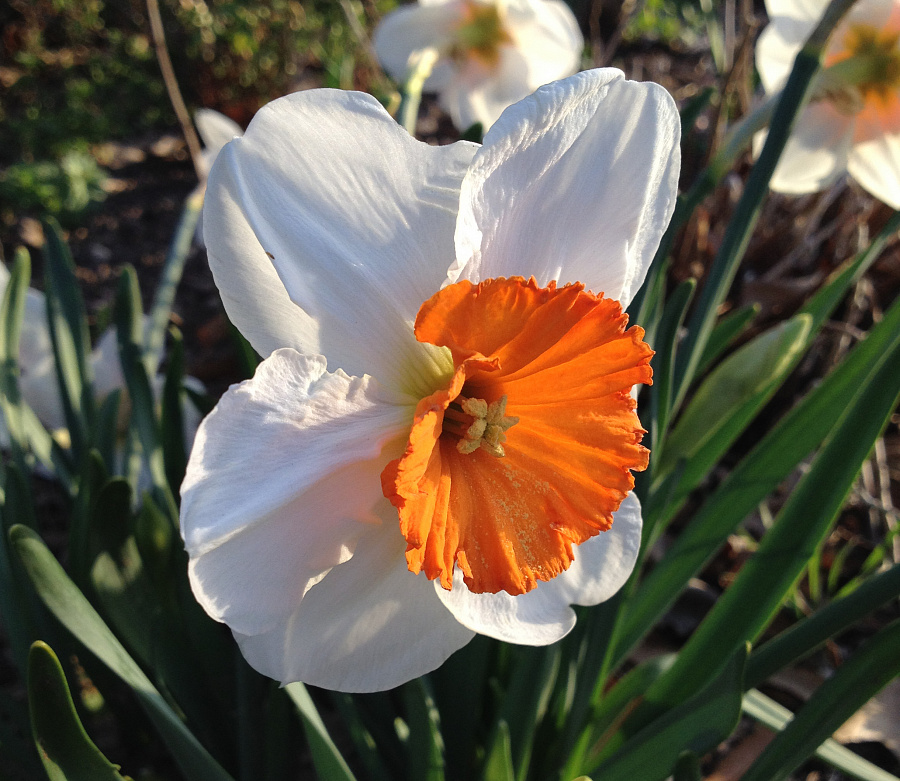 • Окраска цветка : лепестки цветка жемчужно-белые с крупной плоской короной насыщенно-оранжевого оттенка