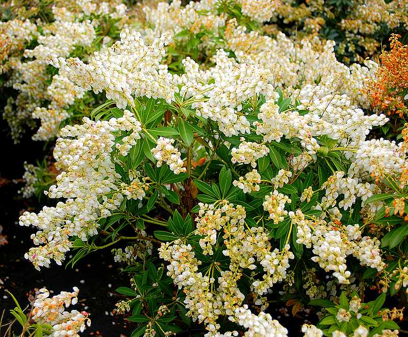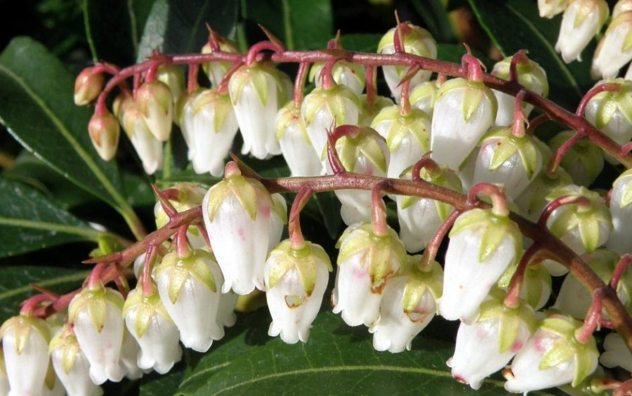 Глянцевые листики красиво отражают цвет. В сезон кустарник покрывается белоснежными цветами, и украшают сад до конца апреля. Затем на ветках появляются тёмные ягоды. Этот вид пиериса имеет плоские корни, которые располагаются близко к поверхности. Чтобы кустарник хорошо перенёс зиму, следуют мульчировать землю листвой.