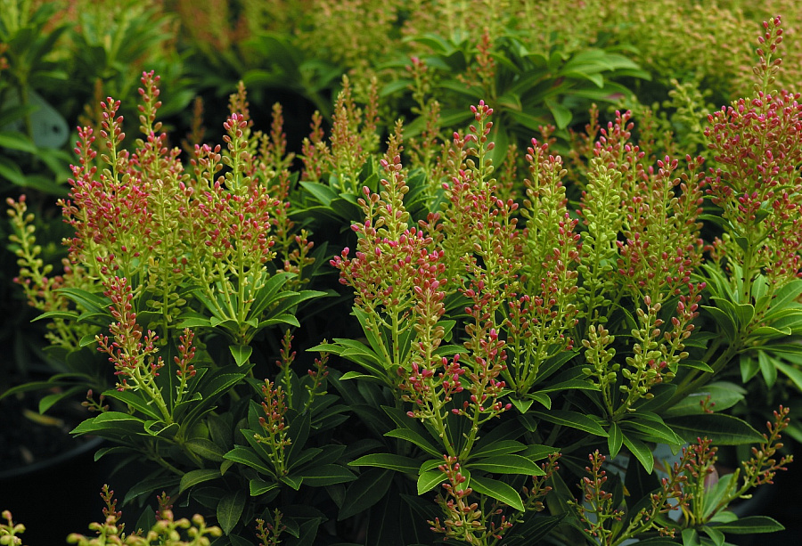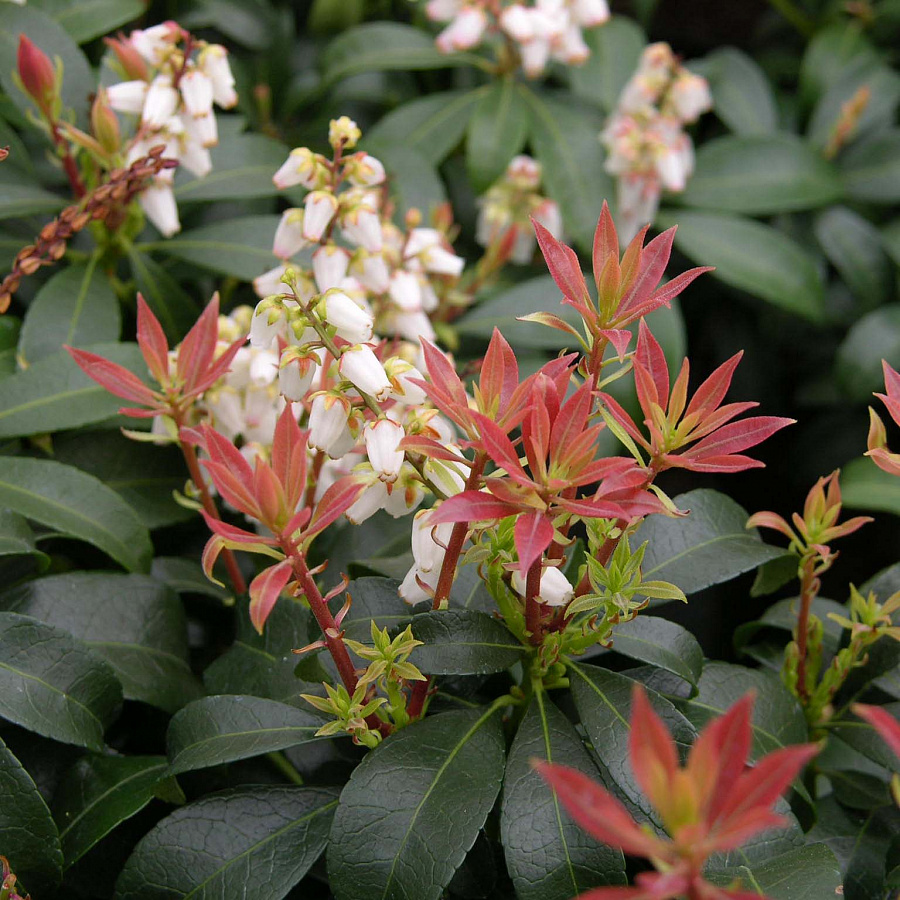 Саженцы Пиериса японского Дебютант (Debutante) – кустарник, который ценят не только за красоту, но и за медленный рост. Максимальный размер полтора метра, причём размер одинаковый, что в высоту, что в длину. У молодых растений кора гладкая, у более старых – отслаивающаяся полосками.