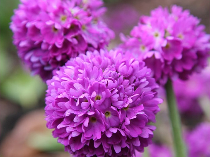 Растение высотой до 30 см, с крупными, морщинистыми листьями. Цветки белого, розового, красного, сине-фиолетового оттенка собраны в шаровидные соцветия на крепких цветоносах высотой 10-15 см. Размножают примулы семенами, делением куста и листовыми черенками. Семена следует высевать осенью в год сбора в открытый грунт. Высаживать примулы надо с таким расчетом, чтобы посадки были сомкнутыми, и между розетками листьев не было открытого пространства, так как растения не любят этого. На постоянное место высаживают весной или осенью второго года. Молодые растения зацветают на второй — третий год. Цветение примул довольно продолжительно с апреля до конца июня. Хорошо выглядят как в одиночных посадках, так и группами. Красивые плотные соцветия великолепны для срезки.