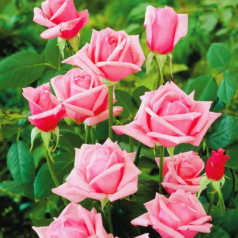 Саженцы чайно-гибридной розы Карина привлекательны для цветоводов непрерывным цветением на протяжении всего сезона. Формирование бутонов останавливают только заморозки. Сорт среднерослый, компактный куст в высоту достигает 1-1,1 м. Цветы очень душистые, крупные, в диаметре больше 10 см. Бутоны изящной бокаловидной формы.