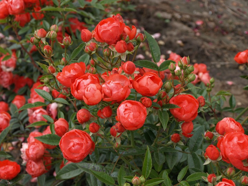 Высота взрослого почвопокровного куста – 45-55 сантиметров, ширина – около 80 сантиметров. Листочки небольшие, оливково-зеленые. На одном стебле завязывается не менее 5-10 махровых цветочков диаметром 4-6 сантиметров, окрашенных в оранжево-красный цвет.