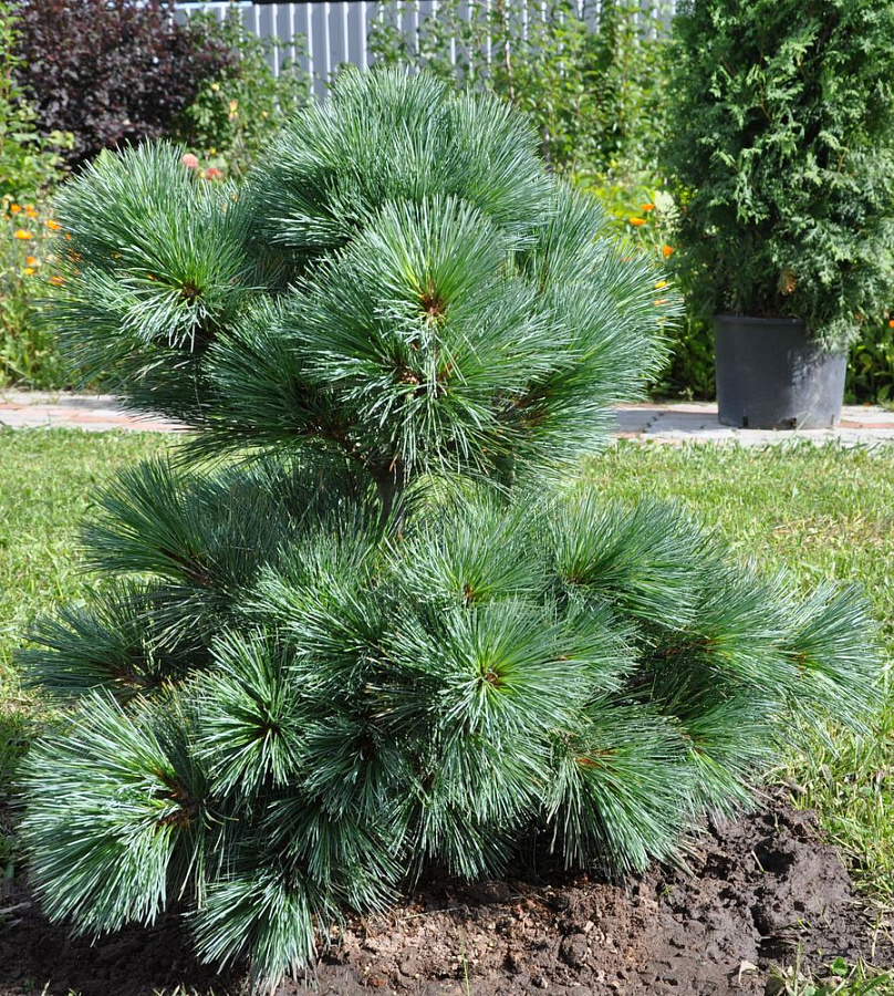 Саженцы сосны Веймутова Радиаты (Radiata) – проверенный годами сорт хвойных кустарников с ажурными округлыми кронами, усеянными свечами светлых шишек. Высота крупномеров достигает 2 м. Диаметр кроны 1,5-2 м. Форма кроны неравномерно-округлая. Компактность растения позволяет его использовать в любых ландшафтных вариациях. Особо примечательна сосна Веймутова Радиата своей мягкой длинной хвоей и смолистыми светло-бурыми почками.