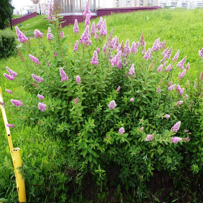 Саженцы Спиреи Дугласа (Spiraea douglasii) – лиственный пряморастущий кустарник, высотой до 200 сантиметров. Сорт отличается быстрым ростом и разрастанием. Листья спиреи Дугласа ланцетные продолговатой формы, длиной до 10 сантиметров зеленого цвета. Цветет кустарник с июля по август розовыми мелкими метельчатыми цветками, расположенным на верхушках побегов. Сорт спиреи Дугласа светолюбив. Если его посадить в тень, то он не будет цвести. Предпочитает влажную местность, не терпелив к засухе. Кустарник терпелив к почве, но лучше произрастает на умеренно влажном плодородном грунте. Спирея Дуглас отличается повышенной морозоустойчивостью.