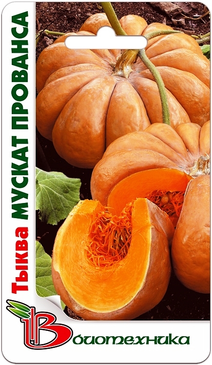 Семена тыквы "Мускат прованса" (Muskat provansa) позволяют выращивать урожай, который подходит для свежего потребления и для разных видов переработок. Период созревания составляет примерно 120 дней от появления массовых всходов. Растение компактное, неприхотливое при выращивании. Плод выровненный, красивый, ребристый, с оранжево-коричневой поверхностью. Тыква достаточно крупная, средний вес может достигать до 8-10 кг. У плодов толстая стенка, а мякоть ароматная и очень сладкая. Окрас урожая ярко-оранжевый как внутри, так и снаружи. Сорт длительного хранения.